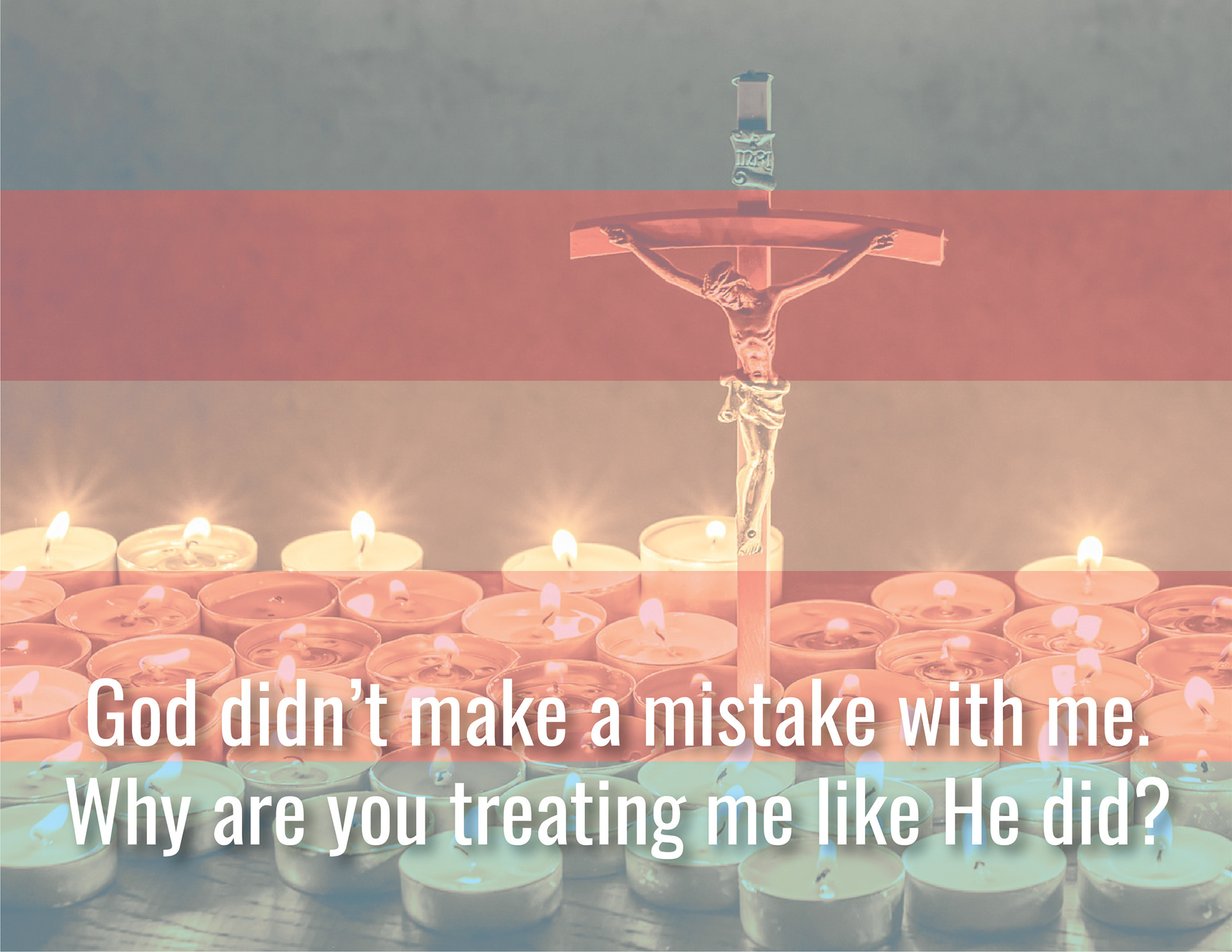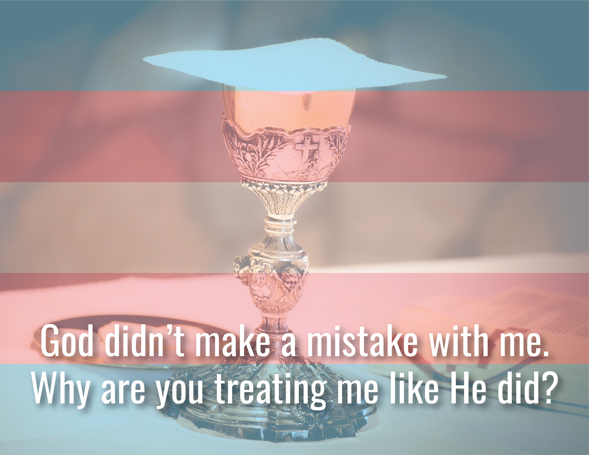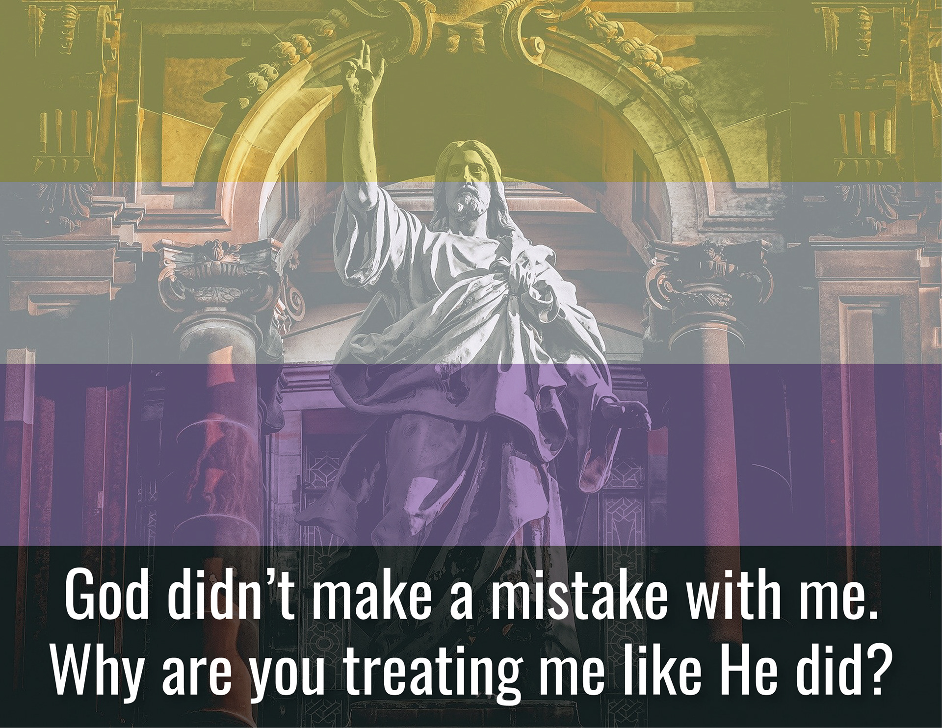 Catholicism Against Queers was a series created for the zine "Queerness & Religiosity", which explored queer individuals and their relationship toward religion. Each image has a color scheme overlaid to represent that specific gender identity or sexual orientation using the colors from their corresponding flags.